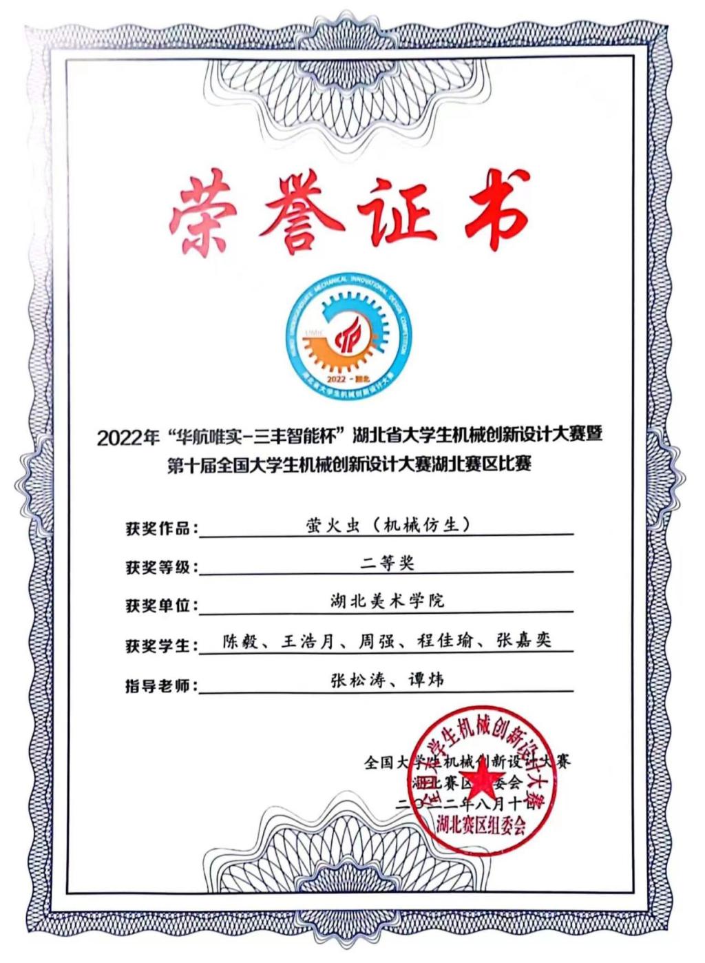 近日,2022年第十届全国老员工机械创新设计大赛湖北分区赛决赛结果揭晓,威廉希尔师生代表队首次参加比赛,张松涛、谭炜老师指导的《机械仿生·萤火虫》荣获省级二等奖。