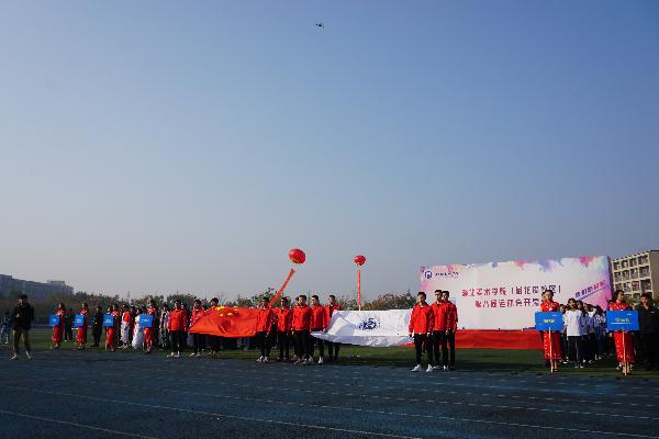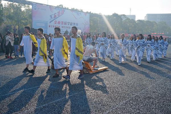 9日上午8时,开幕式的方阵表演正式开始 , 其中, 彩旗队 、 鲜花队 、 国旗队、校旗队在慷慨激昂的音乐声中陆续登场。他们迈着铿锵有力的步伐、昂首挺胸地向主席台走来,他们热情如火,积极向上,时代的强音在他们的脚下踏响。方阵表演中最吸引人注目的就是不同系方阵的不同风格的服装和道具,既能表现出自己独特的个性,又能充分体现各院系的文化和素养。其中,雕塑系方阵根据自身专业的特点,也设计出了独具特色的方阵表演。方阵总共有两个部分,前面是穿罗马服的同学拉着扮演石膏像的同学,代表着西方雕塑。后面是穿青花瓷汉服的同学, 代表中国的瓷器 。同时也分别代表了雕塑系雕塑和陶艺两个专业。他们以独特的艺术风格在众多的方阵中形成了一道靓丽的风景。在开幕式结束后,紧张又热烈的运动项目比赛也缓缓拉开序幕。