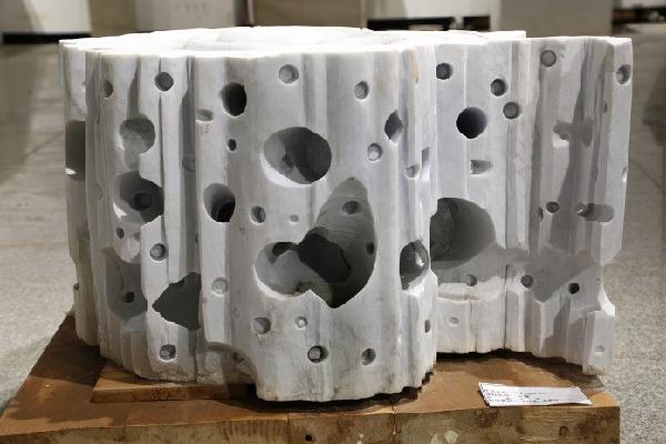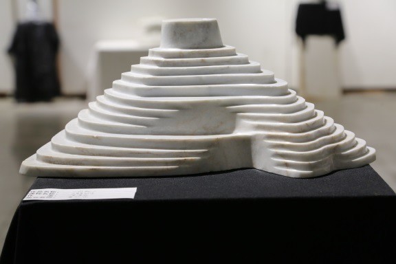 李博超作品《河流》。根据采访的老师我们才知道,这个极简风格的石雕,制作起来非常麻烦。要使用角磨机把大理石进行打磨,这个过程要非常细心,不然会因为使用的力道不对,而每层的间距不一样,每一层的高度也要在大概固定的范围内,保证美感。为了打造这个流动的效果,还要对作品进行抛光,如此反复,才有在展览上一个完美的作品。