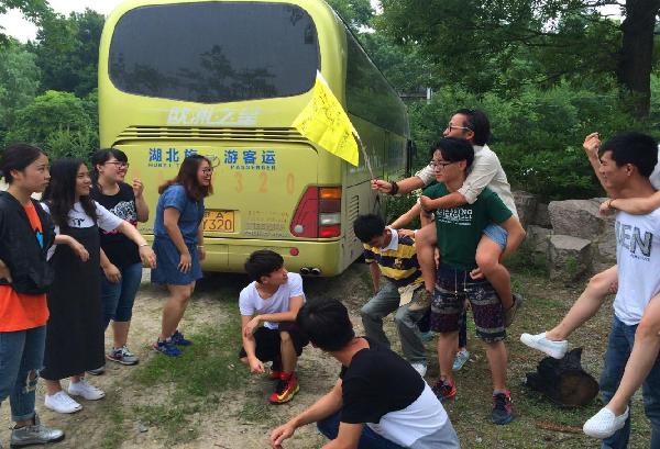 早晨8时许,同学们于食堂门口集合,一起乘车前往位于武汉黄陂区的木兰古门素质拓展。为打破同学们在车上的沉默,教练员在大巴上开展了一系列以“破冰”为主题的互动游戏,如提高反应能力的“老师说”,加强团队合作的“前方有难、后方支援”等等。在教练员的引导下,原本上车后默默睡觉、低头玩手机的同学们,都积极活跃地参与进来,一扫原先的沉寂,当然,如此有趣好玩的互动游戏也令众位同学对接下的拓展训练更加期待起来。