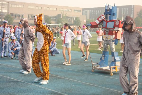 为了体现我们雕塑系的风采和特色,我们在运动会之前进行了多次的讨论、排练以及彩排,我们雕塑系的方阵在前期也是做足了充分的准备。首先,在着装上以造型独特的风格为主,军装武备、手持枪杆的军人形象传递着运动会上的正能量。还准备了灵巧可爱的动物服,活泼而富有滑稽。同学们精心设计的‘擎天柱’在造型上也是力求创新,采用不同种类的材质尝试制作,高大威猛的形象震撼全场!另外在排舞上加入了创意元素,带着面具共舞,以一首幽默流行的歌曲(the fox狐狸叫)带动全场的气氛。我们的共舞点燃了会场的热情,这样的创意无疑令人眼前一亮,同时也吸引了全场的目光!