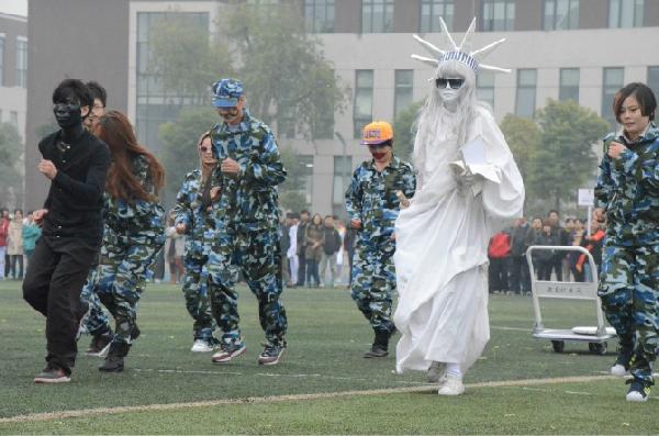庄严的五星红旗、校旗在主席台前迎风飘扬,激越的《运动员进行曲》在田径场上空响起,拉开了运动员、教练员入场序幕。与以往不同,本届开幕式上,来自各院系的13支员工运动员代表组成啦啦队,争相展示拿手绝活儿。玩的就是创意,拼的就是激情,秀的就是时尚。一首首动感旋律、一段段火爆热舞、一次次变化造型、一声声嘹亮口号……多种表演形式一一亮相,清新宁静的绿茵场变成了一个魅力夺目的大舞台。