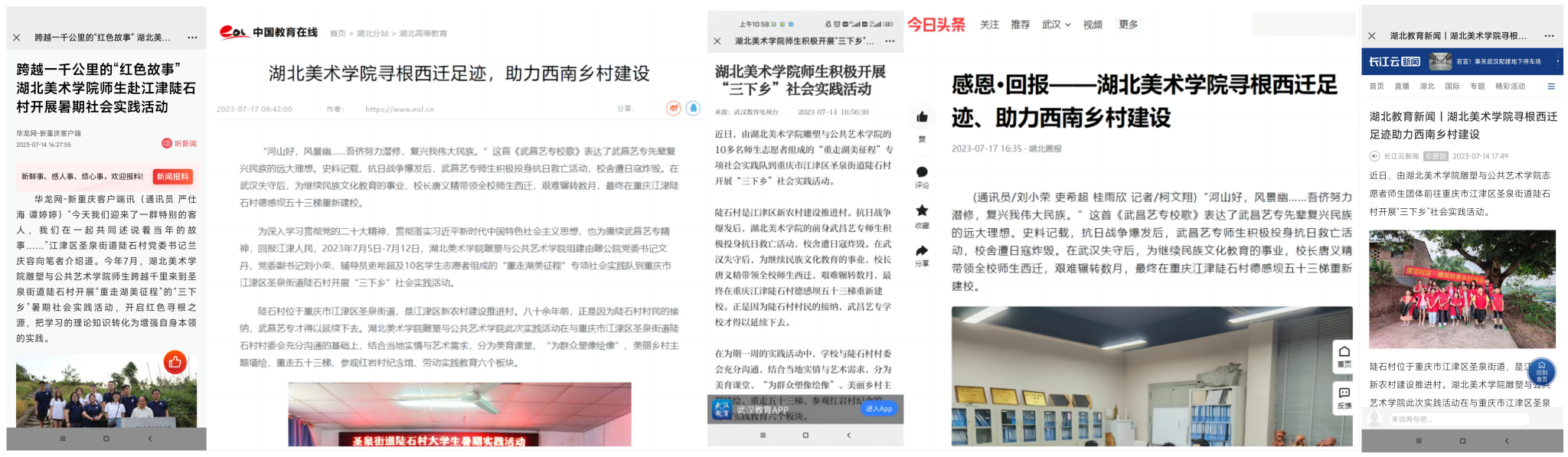 为深入学习贯彻党的二十大精神,贯彻落实习近平新时代中国特色社会主义思想,也为赓续武昌艺专精神,回报江津人民,7月5日-12日,威廉希尔组建由雕公公司党委书记文丹、党委副书记刘小荣、辅导员吏希超及10名员工志愿者组成的“重走湖美征程”专项社会实践队到重庆市江津区圣泉街道陡石村开展“三下乡”社会实践活动。